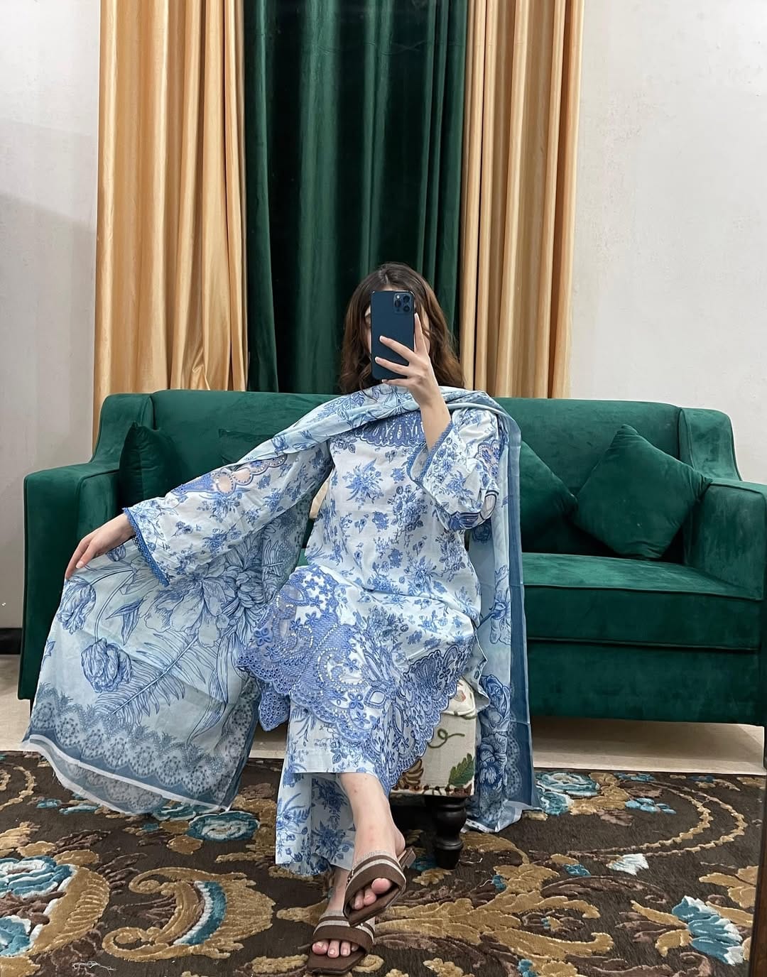 Make every moment shine with our **Premium 3-Piece Stitched Kamiz Set**, tailored from **luxuriously soft cotton** and adorned with **delicate floral prints** and **intricate embroidery** on the neck, sleeves, and daaman.